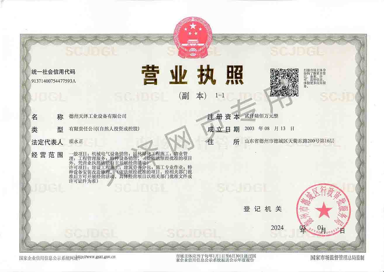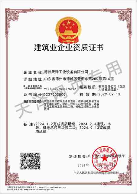 德州天澤工業(yè)設(shè)備有限公司成立于2003年(前身為德州天元集團天明工業(yè)設(shè)備安裝公司),經(jīng)過20多年的發(fā)展,現(xiàn)成長為擁有職工600余人,各類專業(yè)技術(shù)人員近300余人,年生產(chǎn)能力兩億元以上,以建筑機電安裝工程、消防設(shè)施安裝工程施工為主,集建筑工程施工、市政工程施工、建筑智能化工程施工、園林綠化工程施工、工程管理服務(wù)、物業(yè)管理、電氣機械設(shè)備銷售等多元化經(jīng)營于一體的綜合型企業(yè)。2005年,企業(yè)按照國際標(biāo)準(zhǔn)建立的質(zhì)量管理體系,通過了ISO質(zhì)量管理體系認(rèn)證、環(huán)境管理體系認(rèn)證、職業(yè)健康安全管理體系認(rèn)證。施工工程遍布山東、河北、四川、江蘇等地,最具代表性的工程有:山東省德州市百腦匯資訊廣場機電安裝工程、德州經(jīng)濟開發(fā)區(qū)天元大廈機電安裝工程、陵城區(qū)人民醫(yī)院機電安裝工程、德州金魯班大廈機電安裝工程、河北故城金辰小區(qū)機電安裝工程、北川地震災(zāi)后援建工程等。多年來,公司始終堅持“以人為本,建精品工程,創(chuàng)行業(yè)品牌”的經(jīng)營理念,先后榮獲省(市)級泰山杯、天府杯、魯安杯等獎項,申報各種功法、多項專利。